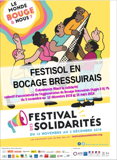 Du 3 novembre au 12 décembre 2018 se tiendra à Bressuire le Festival des Solidarités. Festival national se déroulant du 16 novembre au 2 décembre, partout en France vous pourrez retrouver des évènements et activités fêtant la solidarité. Pour en savoir plus sur les évènements près de chez vous: festivaldessolidarites.org